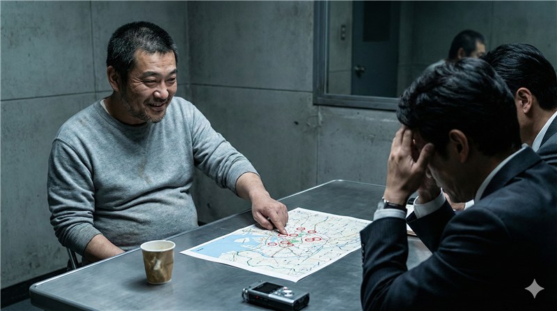 - 展開:スズキが「ここから三度、次は一時間後に爆発します」と宣言し、爆弾の隠し場所を示唆する「クイズ」を出題します 。情報の非対称性を利用し、安全な取調室から言葉だけで警察を翻弄する心理戦が展開されます 。
