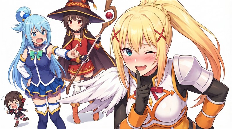 2. ヒロインが残念: 女神アクアは全ステータスが高いものの知能が低く、トラブルメーカーとして機能します。