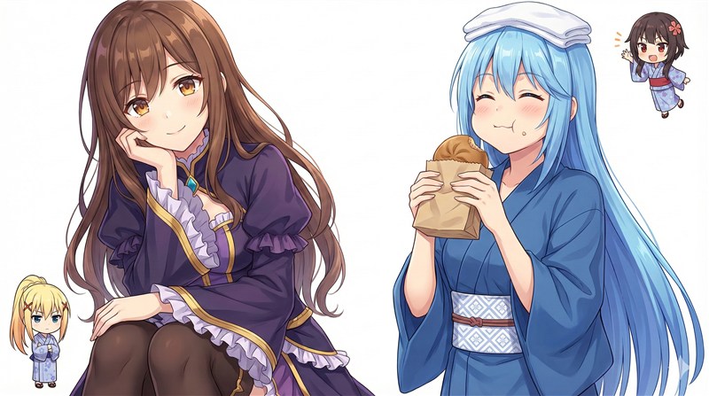 本作の世界観を創り上げたのは、福井県出身の小説家・暁なつめ氏です。暁なつめ氏は、コメディとシリアスを自在に行き来する物語構造や、人間の弱さや愚かさを愛おしむ温かな視線を描くことに定評があります。 イラストを担当するのは三嶋くろね氏です。透明感のある美しい色彩でキャラクターの魅力を引き出す一方で、コメディシーンにおけるコミカルな表情(いわゆる「顔芸」)も豊かに表現し、テキストだけでは伝わりきらない「このすば」の狂気と楽しさを視覚的に決定づけました。